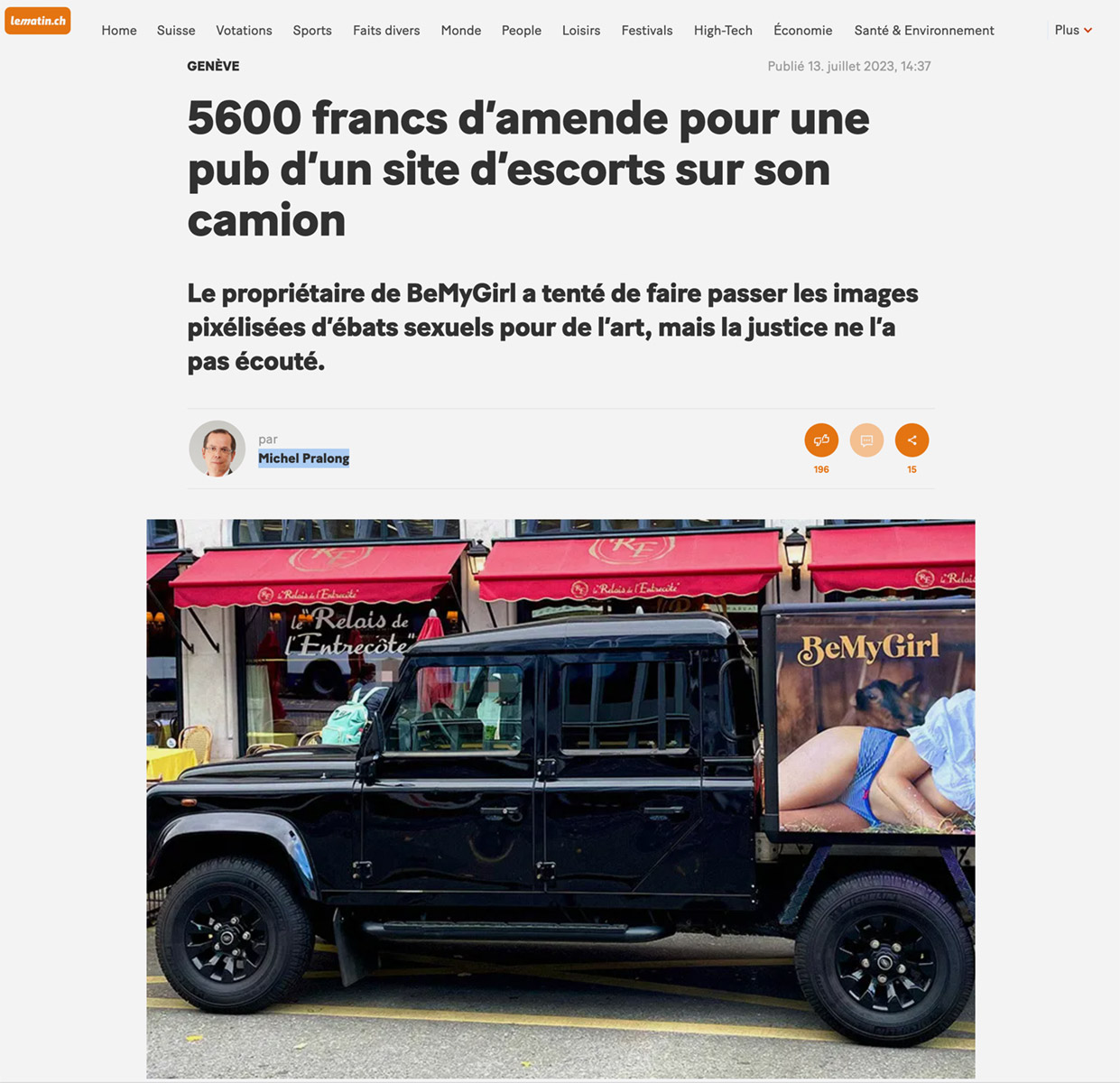 Die Geschichte endete vor Gericht und laut dem Strafbefehl, den die "Tribune de Genève" einsehen konnte, wurde der Besitzer des Fahrzeugs, das er zur Werbung für seine Escort-Girl-Website BemyGirl nutzte, zu einer bedingten Geldstrafe und einer Geldbuße von 5600 Franken verurteilt. Die Gründe für die Verurteilung waren das Zeigen von pornografischen Bildern, die für Minderjährige unter 16 Jahren zugänglich waren, und ein Verstoß gegen das Verkehrsgesetz wegen ... Ablenkung anderer Verkehrsteilnehmer.