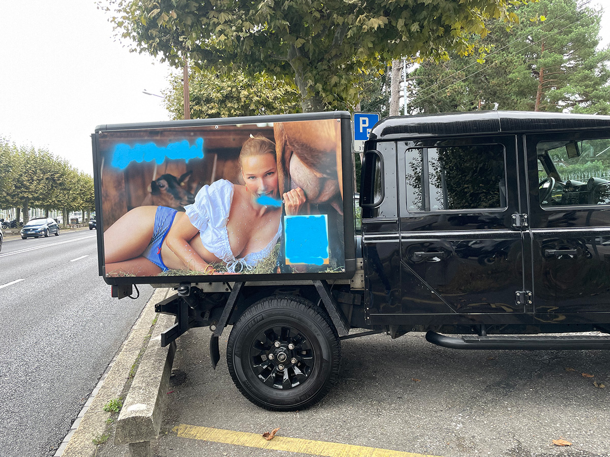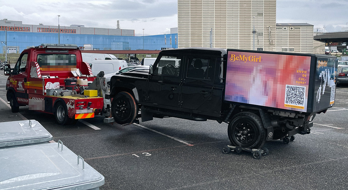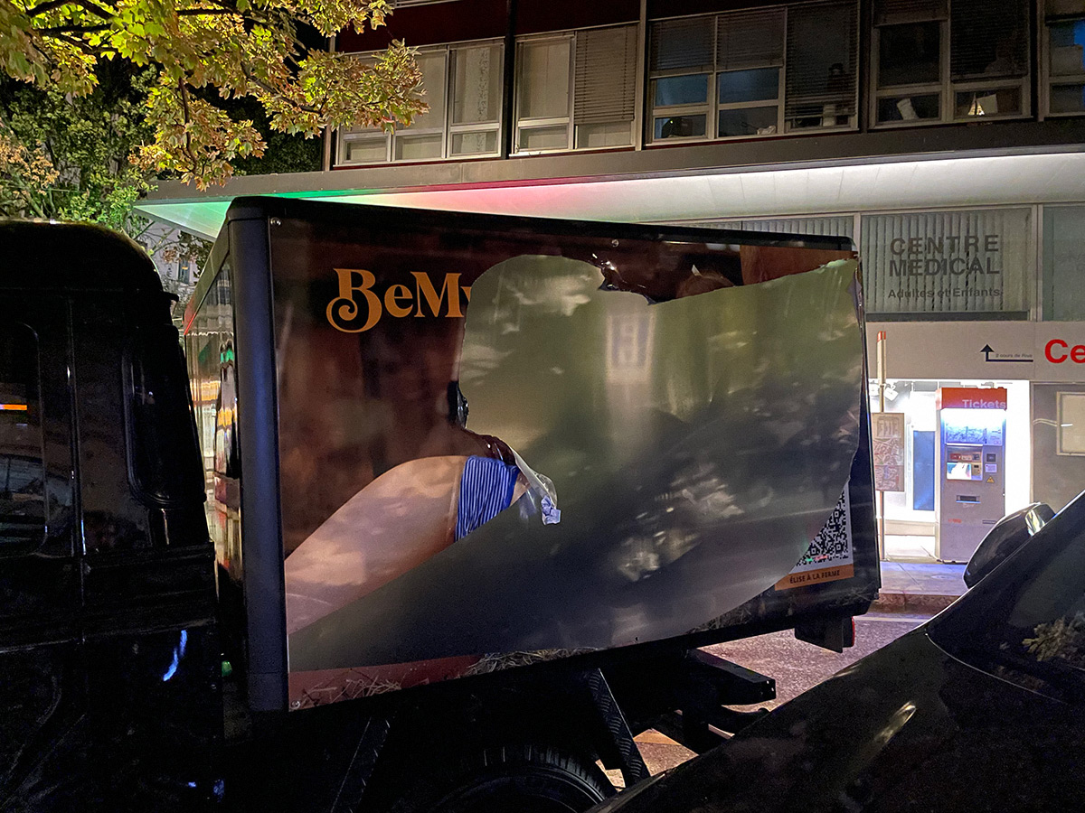 Cuando el aparcamiento del Mont-Blanc se negó a exhibir la campaña "Elise à la ferme", BemyGirl simplemente pegó 3 imágenes de la campaña en su coche de empresa.