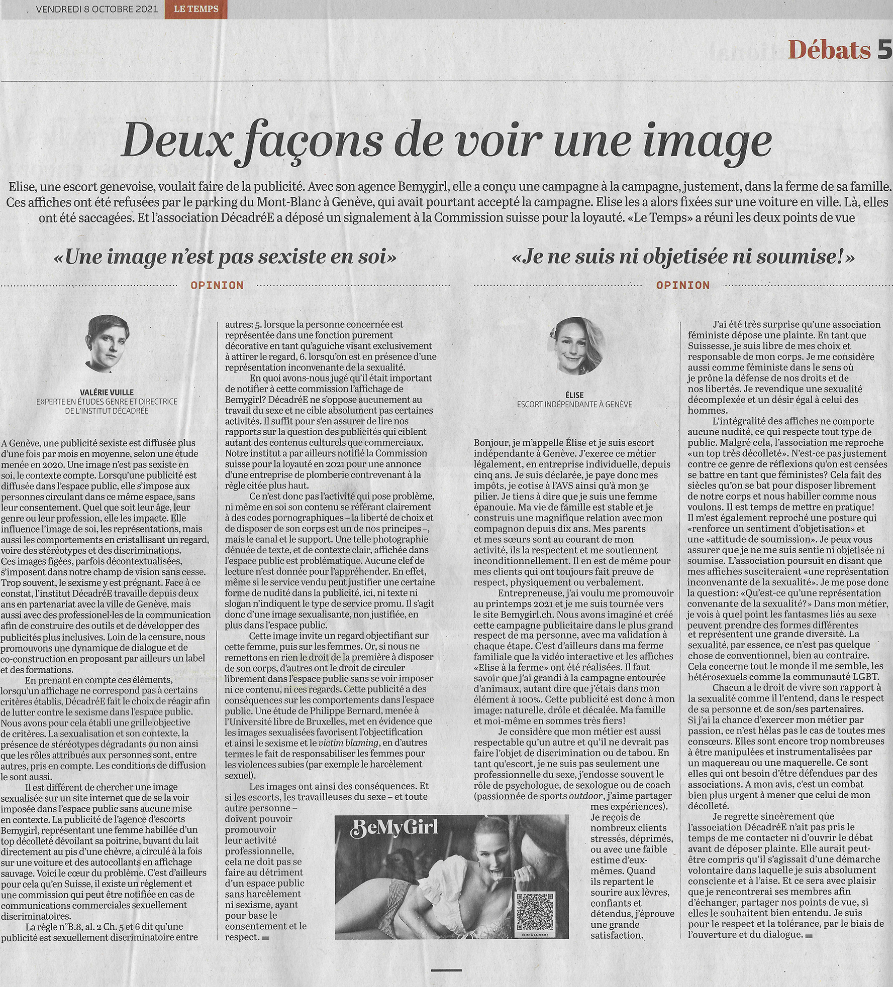 Elise, une escort genevoise, voulait faire de la publicité, avec sa plateforme publicitaire Bemygirl. Ses affiches ont été refusées par le parking du Mont-Blanc à Genève, qui avait pourtant accepté la campagne. Elise les a alors fixées sur une voiture en ville, où elles ont été saccagées. Et l’association DécadréE a déposé un signalement à la Commission suisse pour la loyauté. «Le Temps» a réuni les deux points de vue